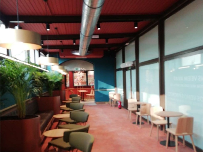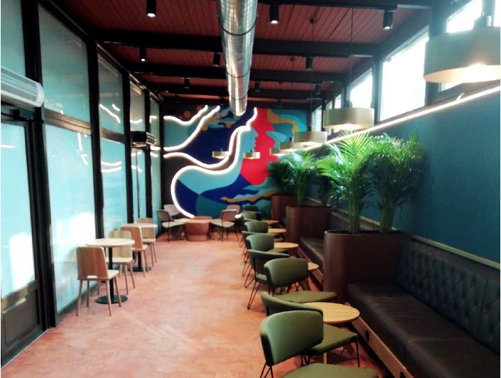 The space features a contemporary and welcoming aesthetic, where warm tones, natural materials, and strategically distributed lighting create an atmosphere that encourages comfort and relaxation, supporting longer customer dwell time. Furniture was selected both for comfort and to optimize customer flow within a high-traffic retail environment.