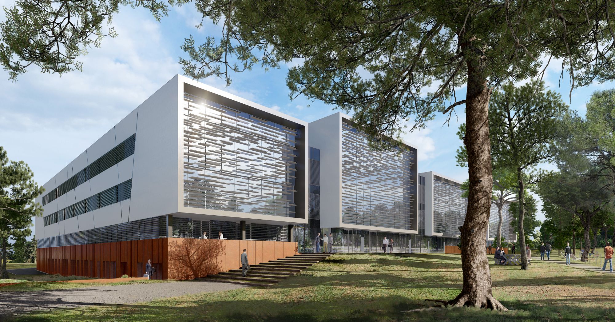 La construction s’intègre ainsi dans une pinède constituée de pins maritimes de 8 à 12 mètres de hauteur conservée au maximum et qui servira d’écrin végétalisé au site de l’IRSN. Les altimétries des voiries et les parkings seront par ailleurs adaptés à la pinède pour conserver les sujets existants.
